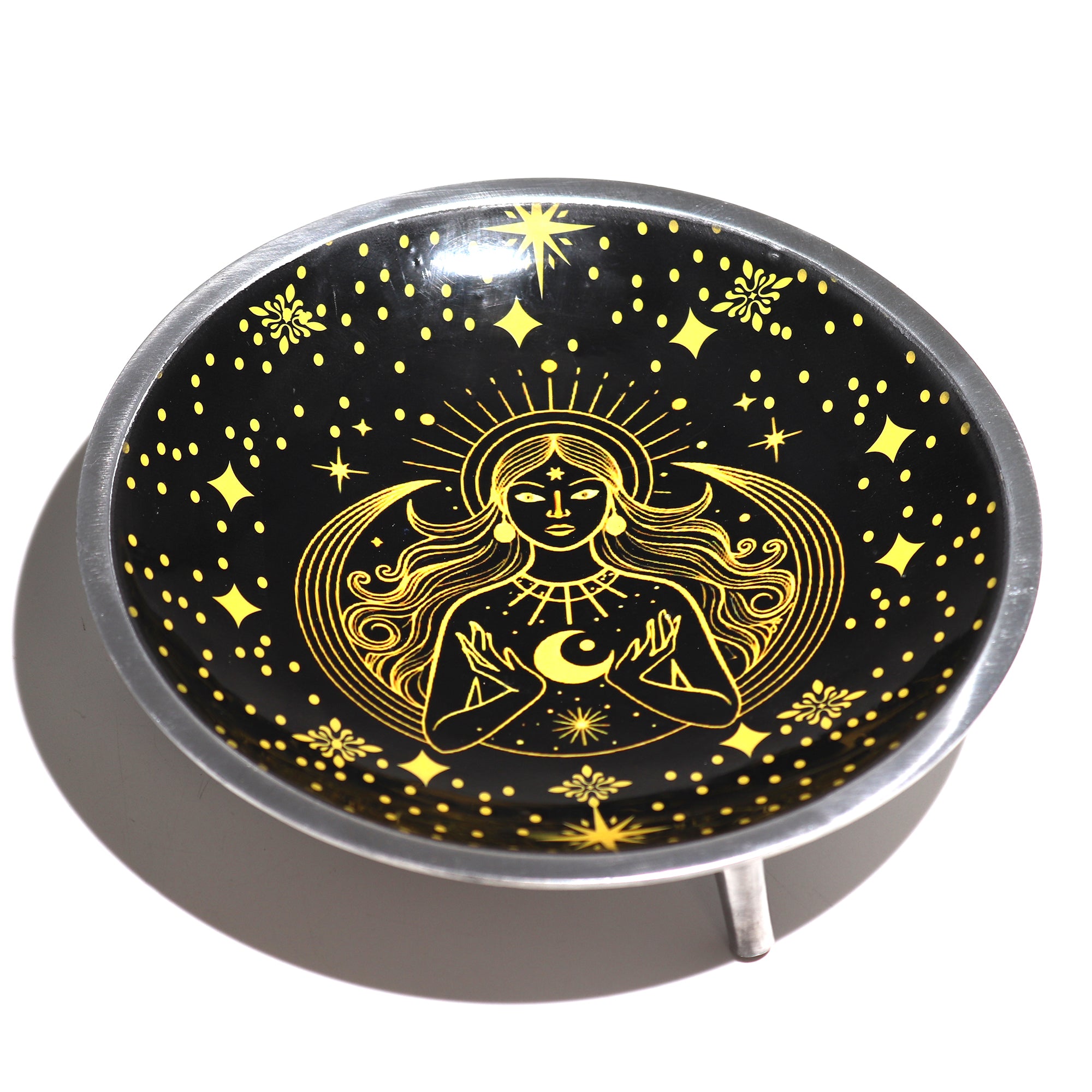 Elevate your spiritual rituals with this stunning Triple Leg Enamelled Offering Plate, featuring an elegant Gold Goddess design against a sleek black backdrop, symbolising unity & enlightenment. Perfect for ceremonies and sacred practices, this beautifully crafted piece brings intention and artistry to your space.